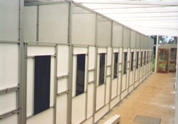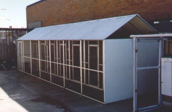 of Washington - Seattle, WA Bird Holding unit with pitched roof. 8' W x 28' L x 6' H. 7 units 4' x 5' and a 3' safety aisle. 1 x 1 - 16 ga. wire. |
